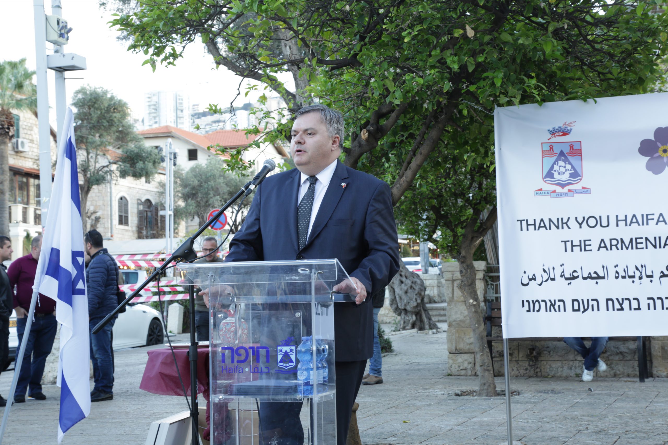 Եբրայերեն լեզվով ելույթ ունեցավ ՀՀ արտակարգ և լիազոր դեսպան պարոն Արման Հակոբյանը, ով պատմական գնահատեց քաղաքապետարանի այս որոշումը։ Դեսպանն ասաց, որ ոչ միայն հայֆայահայերի ու Իսրայելի հայկական համայնքի համար, այլև ողջ աշխարհի հայության համար չափազանց կարևոր է իսրայելի իր մեծությամբ երրորդ քաղաքում Հայոց Ցեղասպանության անմեղ զոհերի հիշատակին նվիրված հուշարձան բացելն ու վստահությամբ կարելի է ասել, որ ճիշտ ճանապարհ է ուրվագծվում Իսրայելում Հայոց Ցեղասպանության ճանաչման համար: